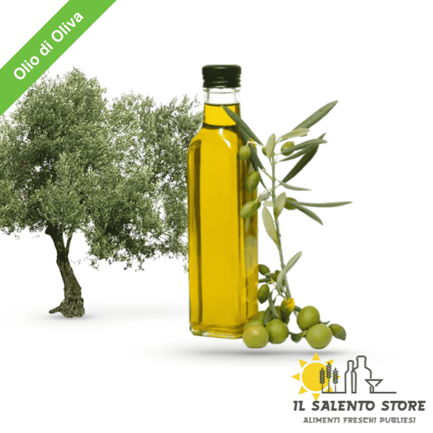 Olio di oliva extravergine Salentino, succo di oliva puro, olive raccolte, molite e imbottigliate.